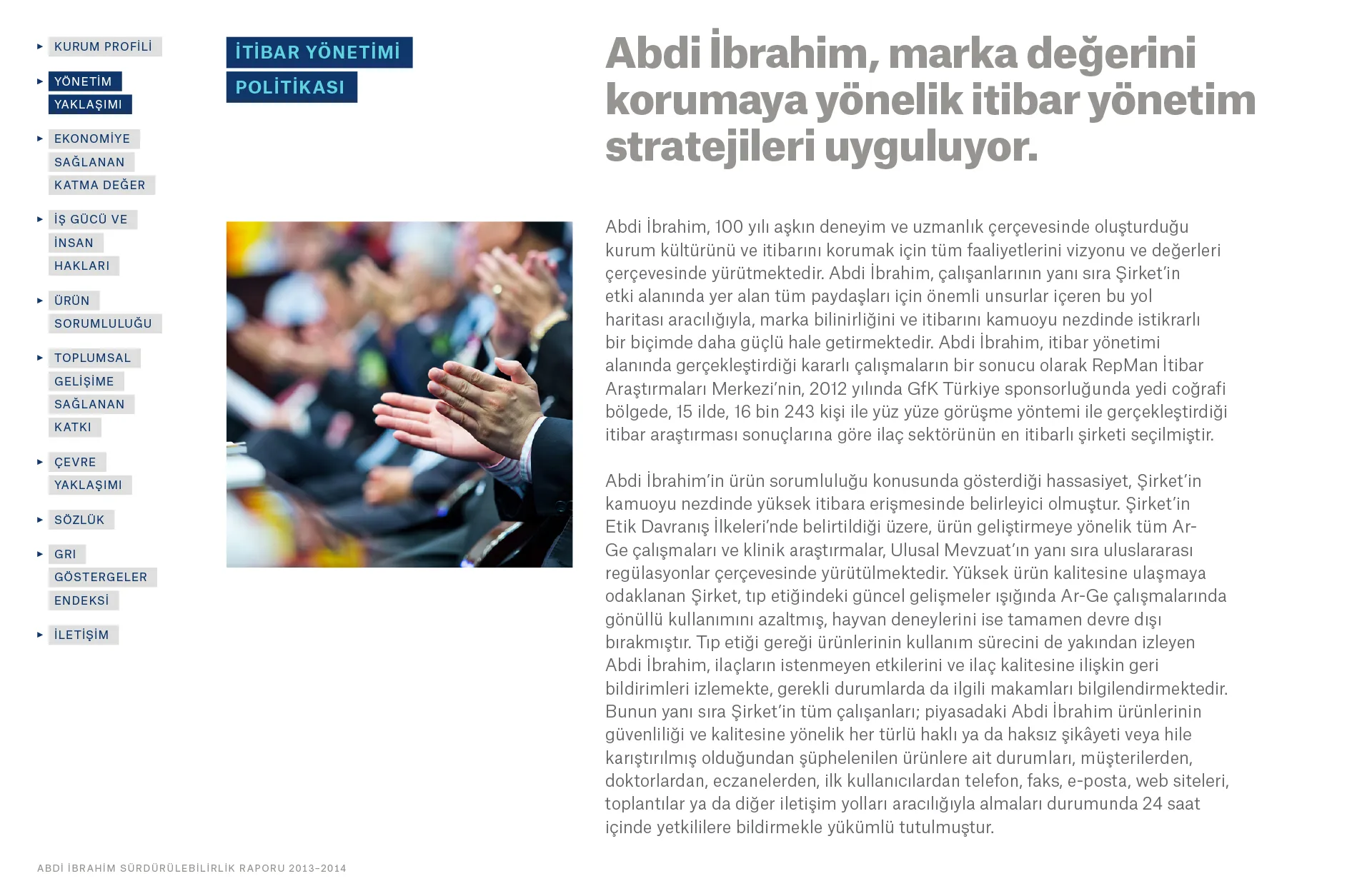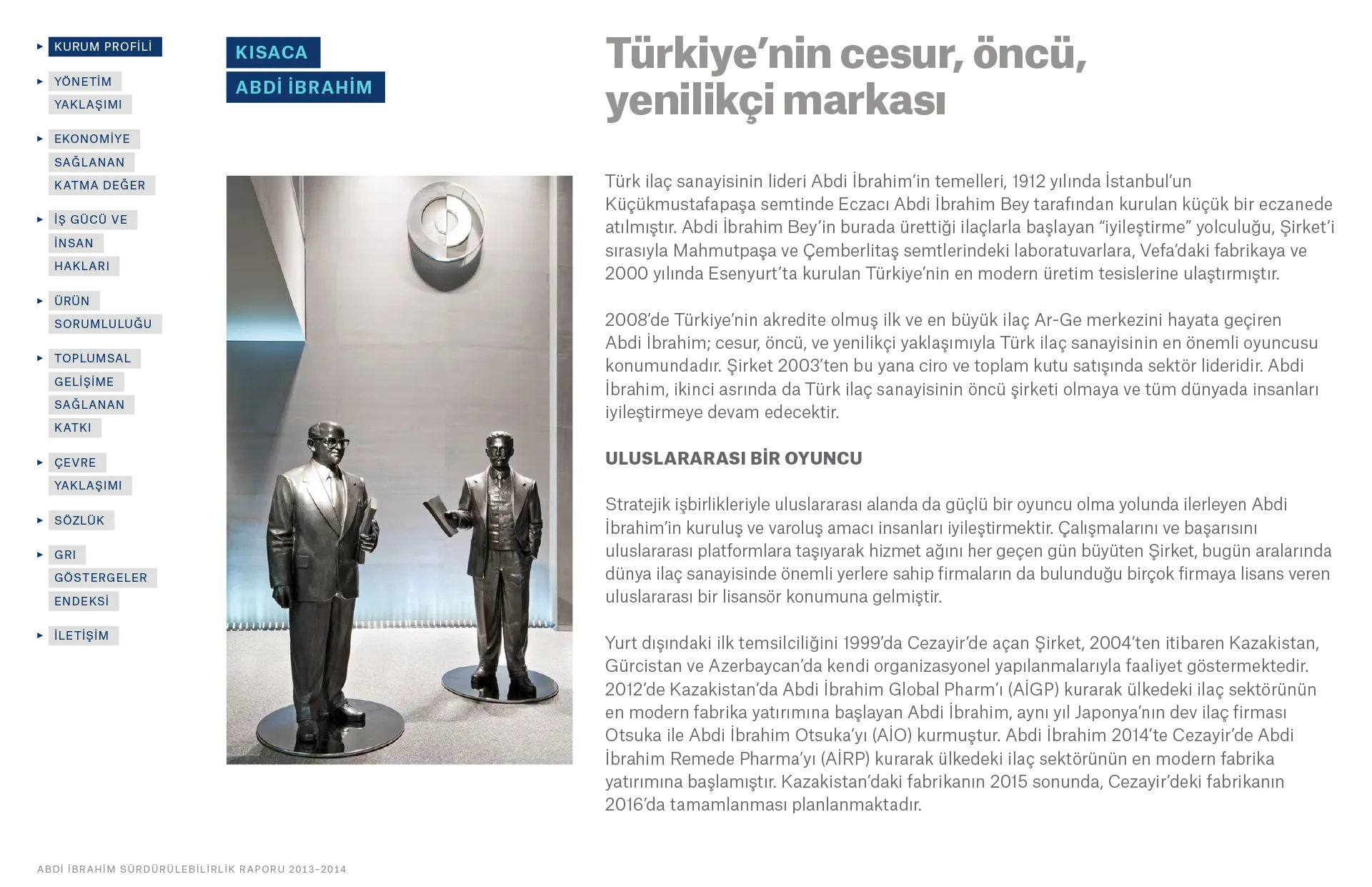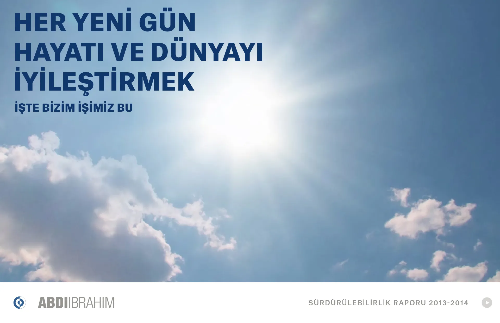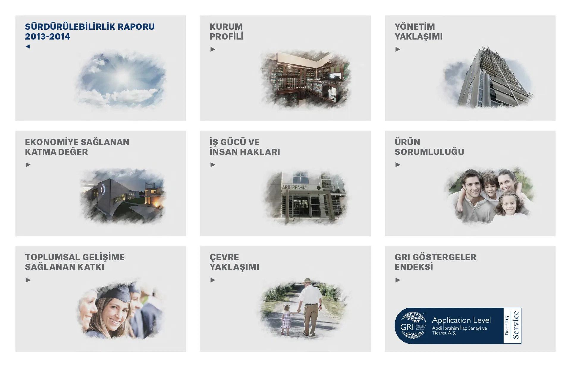 Türk ilaç sanayisinin lider şirketi olarak, uluslararası bir marka olma yolunda yenilikçi ürün ve hizmetleri, cesur ve öncü girişimleriyle dokunduğu hayatları iyileştirmek için tutkuyla çalışan Abdi İbrahim, kurumsal değerlerinden güç alarak yenilikçi ve öncü çizgisini sürdürülebilir kılmaya odaklanıyor. GRI ilkeleri doğrultusunda sürdürülebilirlik raporlaması gerçekleştiren bir şirket olmanın yanı sıra BM Küresel İlkeler Sözleşmesi imzacısı olan Abdi İbrahim’in 2013-2014 dönemini kapsayan Sürdürülebilirlik Raporu, “Her yeni gün hayatı ve dünyayı iyileştirmek. İşte bizim işimiz bu” başlığıyla yayınlandı.