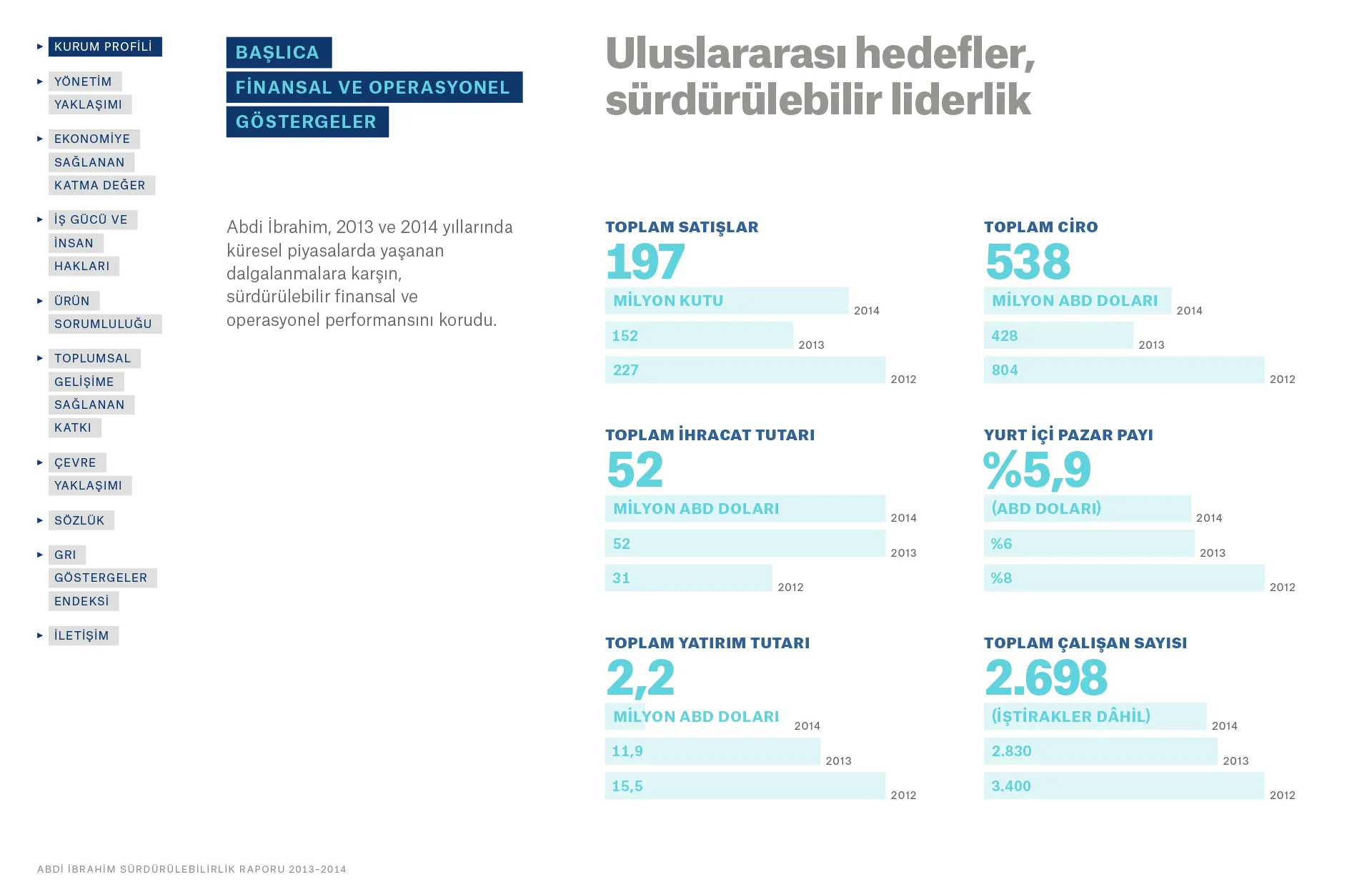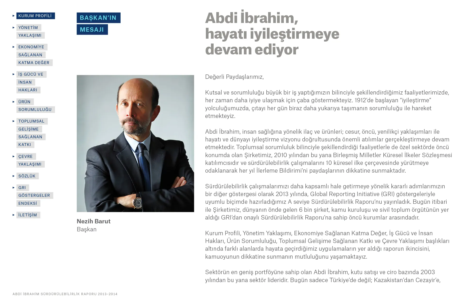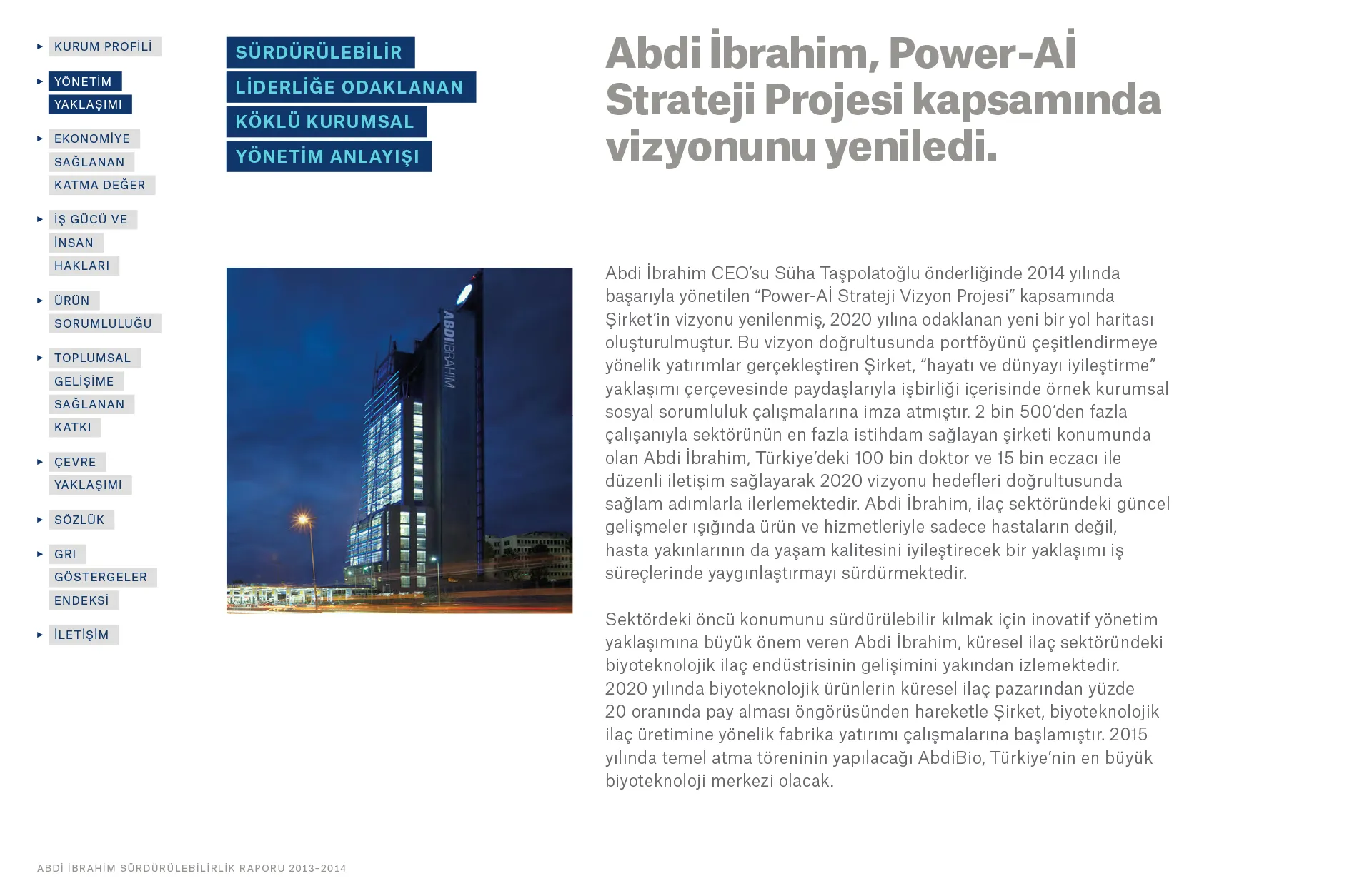 Türk ilaç sanayisinin lider şirketi olarak, uluslararası bir marka olma yolunda yenilikçi ürün ve hizmetleri, cesur ve öncü girişimleriyle dokunduğu hayatları iyileştirmek için tutkuyla çalışan Abdi İbrahim, kurumsal değerlerinden güç alarak yenilikçi ve öncü çizgisini sürdürülebilir kılmaya odaklanıyor. GRI ilkeleri doğrultusunda sürdürülebilirlik raporlaması gerçekleştiren bir şirket olmanın yanı sıra BM Küresel İlkeler Sözleşmesi imzacısı olan Abdi İbrahim’in 2013-2014 dönemini kapsayan Sürdürülebilirlik Raporu, “Her yeni gün hayatı ve dünyayı iyileştirmek. İşte bizim işimiz bu” başlığıyla yayınlandı.