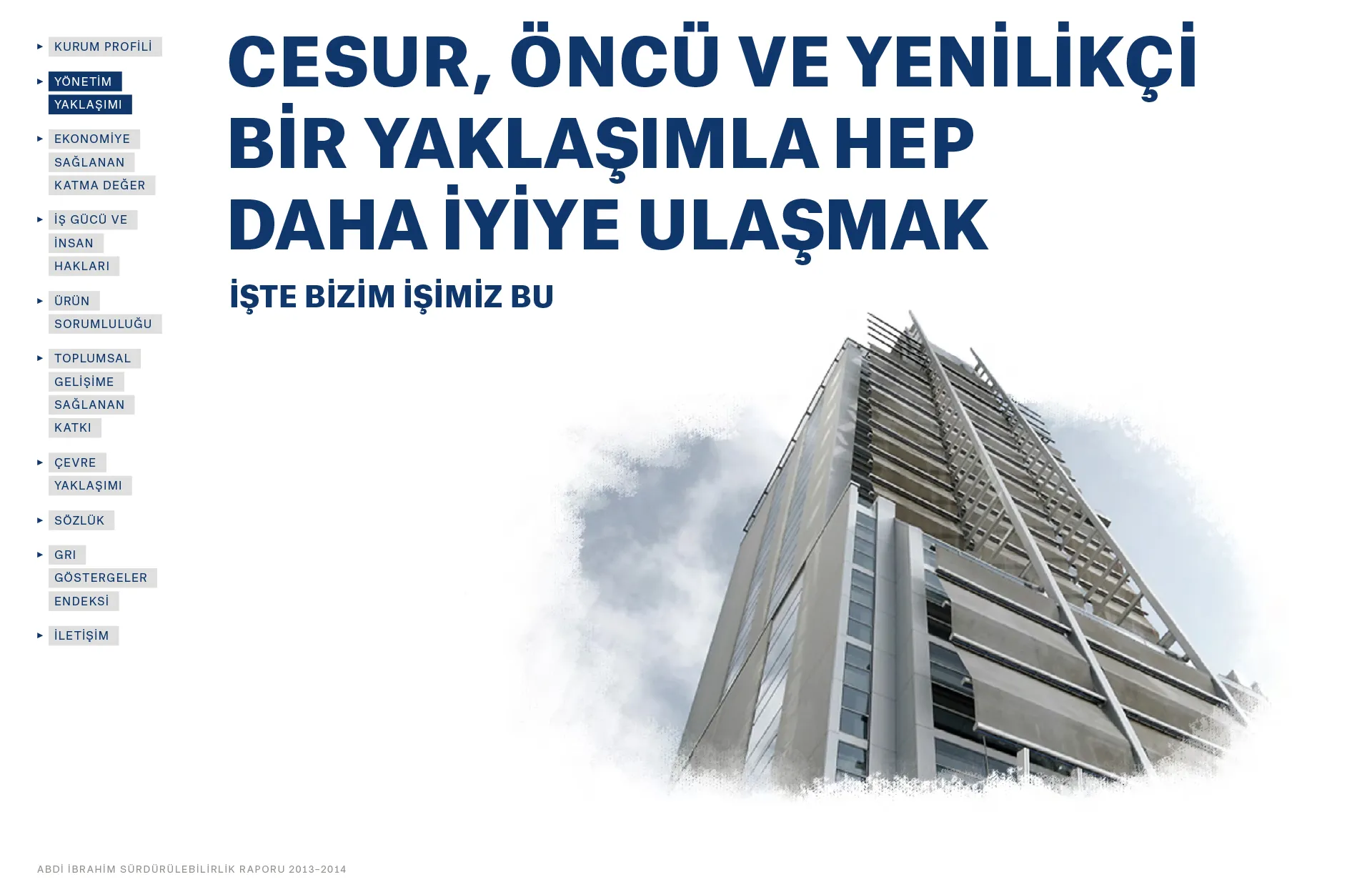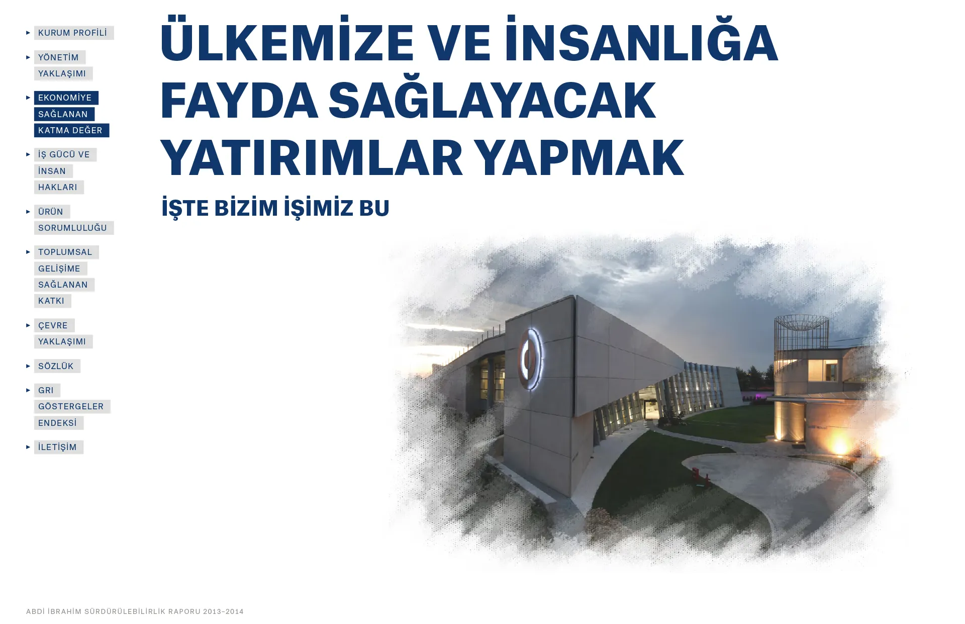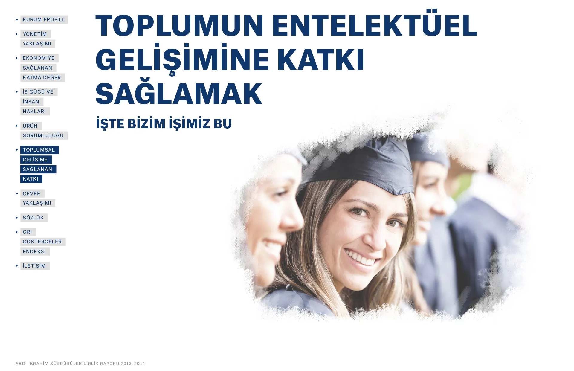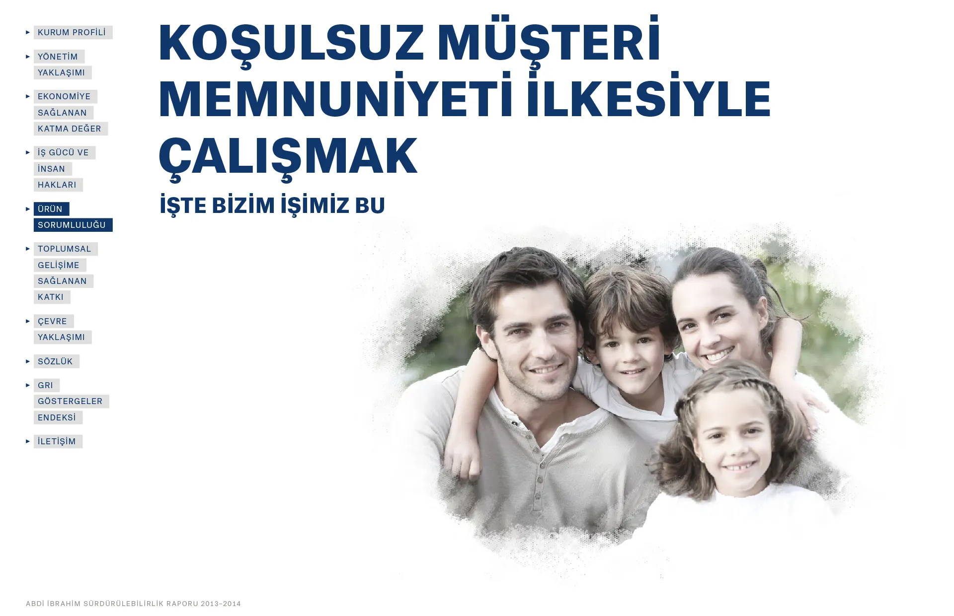 Türk ilaç sanayisinin lider şirketi olarak, uluslararası bir marka olma yolunda yenilikçi ürün ve hizmetleri, cesur ve öncü girişimleriyle dokunduğu hayatları iyileştirmek için tutkuyla çalışan Abdi İbrahim, kurumsal değerlerinden güç alarak yenilikçi ve öncü çizgisini sürdürülebilir kılmaya odaklanıyor. GRI ilkeleri doğrultusunda sürdürülebilirlik raporlaması gerçekleştiren bir şirket olmanın yanı sıra BM Küresel İlkeler Sözleşmesi imzacısı olan Abdi İbrahim’in 2013-2014 dönemini kapsayan Sürdürülebilirlik Raporu, “Her yeni gün hayatı ve dünyayı iyileştirmek. İşte bizim işimiz bu” başlığıyla yayınlandı.