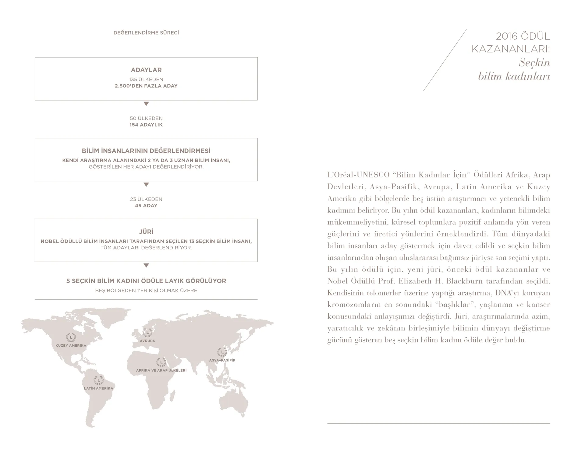 L’Oréal-UNESCO “Bilim Kadınlar İçin” ödülleri Afrika, Arap Devletleri, Asya-Pasifik, Avrupa, Latin Amerika ve Kuzey Amerika gibi bölgelerde beş üstün araştırmacı ve yetenekli bilim kadınını belirliyor. 2016 yılının ödül kazananları, kadınların bilimdeki mükemmeliyetini, küresel toplumlara pozitif anlamda yön veren güçlerini ve üretici yönlerini örneklendirdi. Tüm dünyadaki bilim insanları aday göstermek için davet edildi ve seçkin bilim insanlarından oluşan uluslararası bağımsız jüriyse son seçimi yaptı.