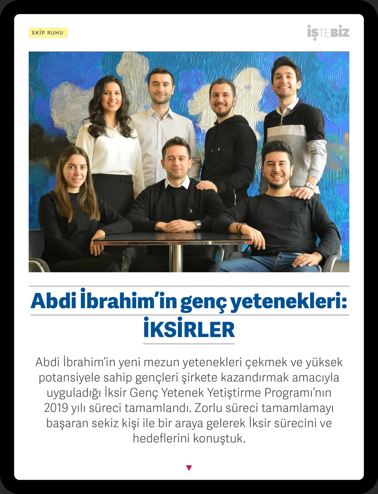 Türkiye’nin lider ilaç şirketi olan ve uluslararası pazarlarda büyümesini sürdüren Abdi İbrahim, yaklaşık 5 bin kişilik bir ekipten oluşuyor. Şirket çalışanlarına yönelik olarak üç aylık periyotlarda yayınlanan kurumsal iç iletişim dergisi İş’te Biz’de; Abdi İbrahim’in Türkiye’de ve uluslararası pazarlarda hayata geçirdiği projeler, etkinlikler, lansmanlar, başarılar, iş birlikleri, alınan ödüller ve daha pek çok gelişmeyle ilgili haberler ve söyleşiler yer alıyor. Dergi, mobil uygulama üzerinden ve intranetten takip edilebiliyor.