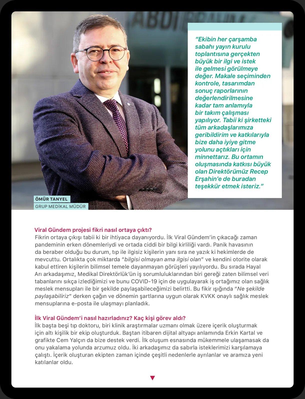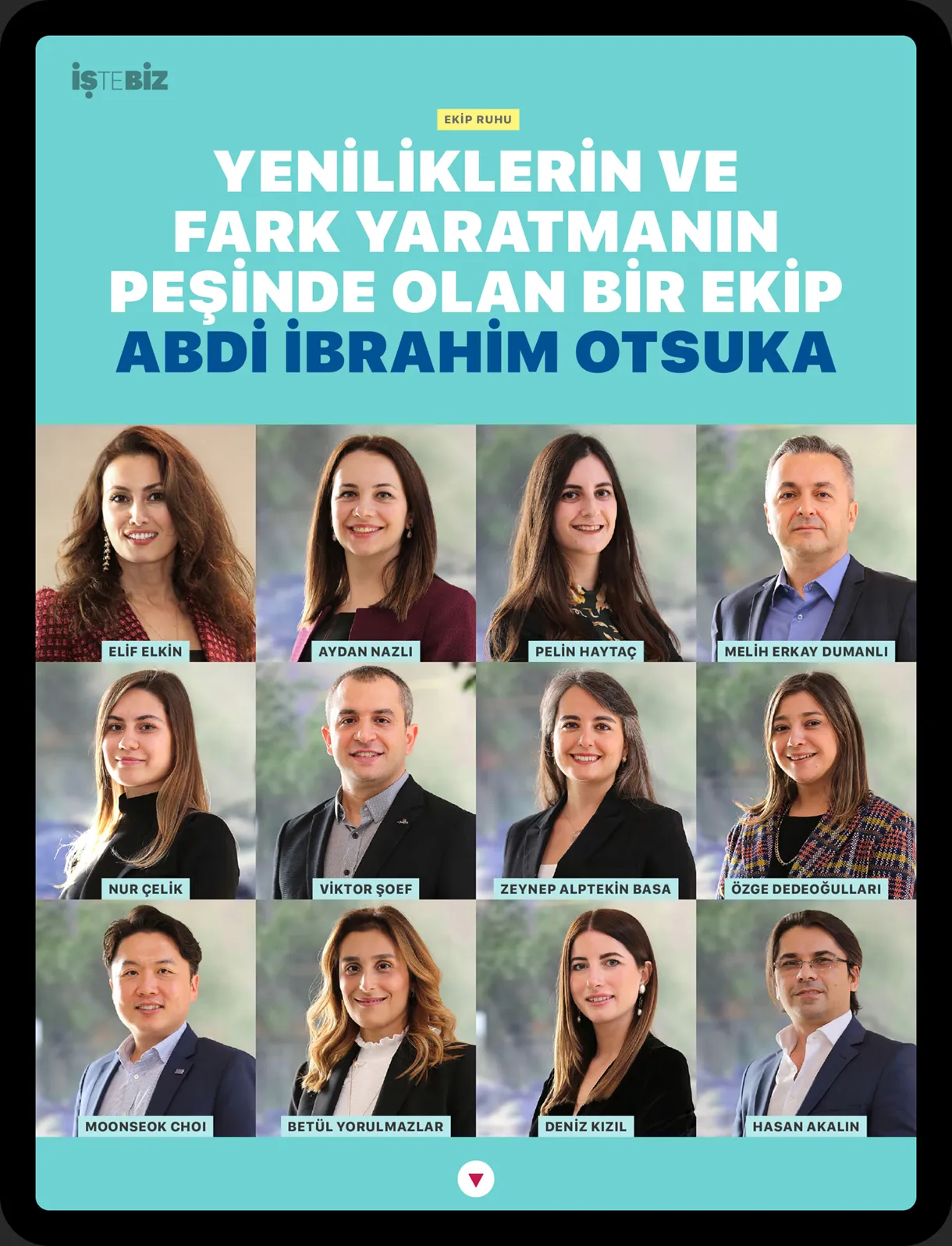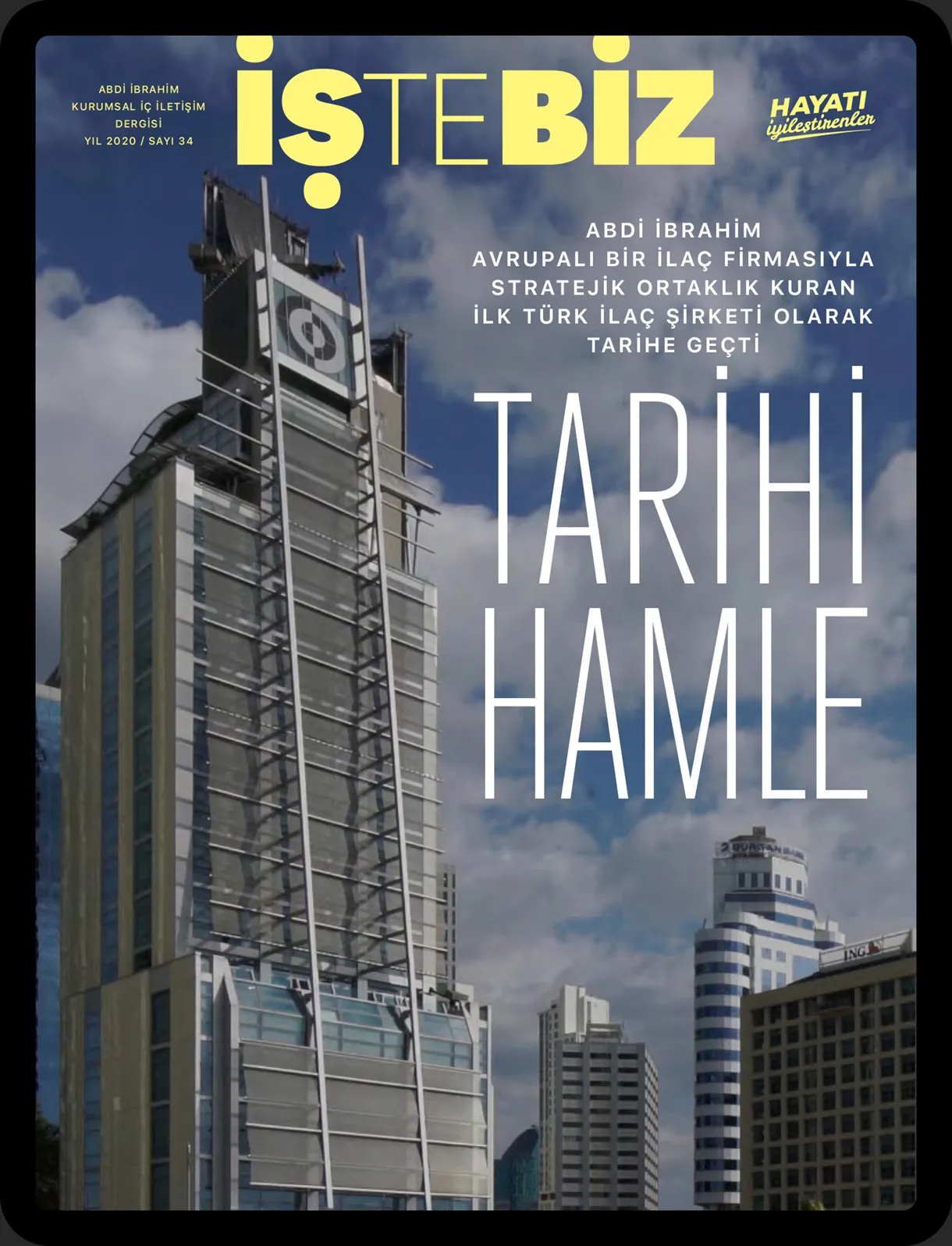 Türkiye’nin lider ilaç şirketi olan ve uluslararası pazarlarda büyümesini sürdüren Abdi İbrahim, yaklaşık 5 bin kişilik bir ekipten oluşuyor. Şirket çalışanlarına yönelik olarak üç aylık periyotlarda yayınlanan kurumsal iç iletişim dergisi İş’te Biz’de; Abdi İbrahim’in Türkiye’de ve uluslararası pazarlarda hayata geçirdiği projeler, etkinlikler, lansmanlar, başarılar, iş birlikleri, alınan ödüller ve daha pek çok gelişmeyle ilgili haberler ve söyleşiler yer alıyor. Uygulama üzerinden yayınlanan dergi; tablet, telefon ve bilgisayardan takip edilebiliyor.